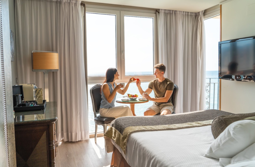 Habitación de ensueño con vistas al mar y todos los lujos para hacer tu estancia memorable. Con ventanales panorámicos. Capacidad para 2 personas. Cuenta con: Smart TV de 42 pulgadas para vivir la experiencia del cine desde el balcón del Mediterráneo (*), habitación de 24 m² aproximadamente, minibar de diseño (**), carta de Almohadas y de Colchones … sumérgete en el mas placentero descanso a la carta (*), dream beds de 1,50m ancho por 2,00m de largo, cuarto de Baño Panorámico, disfruta una experiencia única dejando que el hidromasaje mime tu piel, mientras el mar mima tus sentidos.., con store modificable con mando a distancia, para ducharse con privacidad o con vistas al mar, hidrátate con nuestra ducha y bañera de hidromasaje programable con mando a distancia, mientras sueñas junto al mediterráneo, Amenities exclusivos, magnífico altavoz bluetooth, saborea tu Café Nespresso (**) para tus momentos de relax, dispositivo Chromecast para disfrutar de contenidos multimedia y compartir el contenido de tu teléfono móvil en la TV, todo ello sin olvidarnos de las facilidades para aquellos que quieran combinar el trabajo con su tiempo de descanso aprovechando nuestra conexión wifi (*) y nuestro servicio de habitaciones donde: “Todo es posible”.